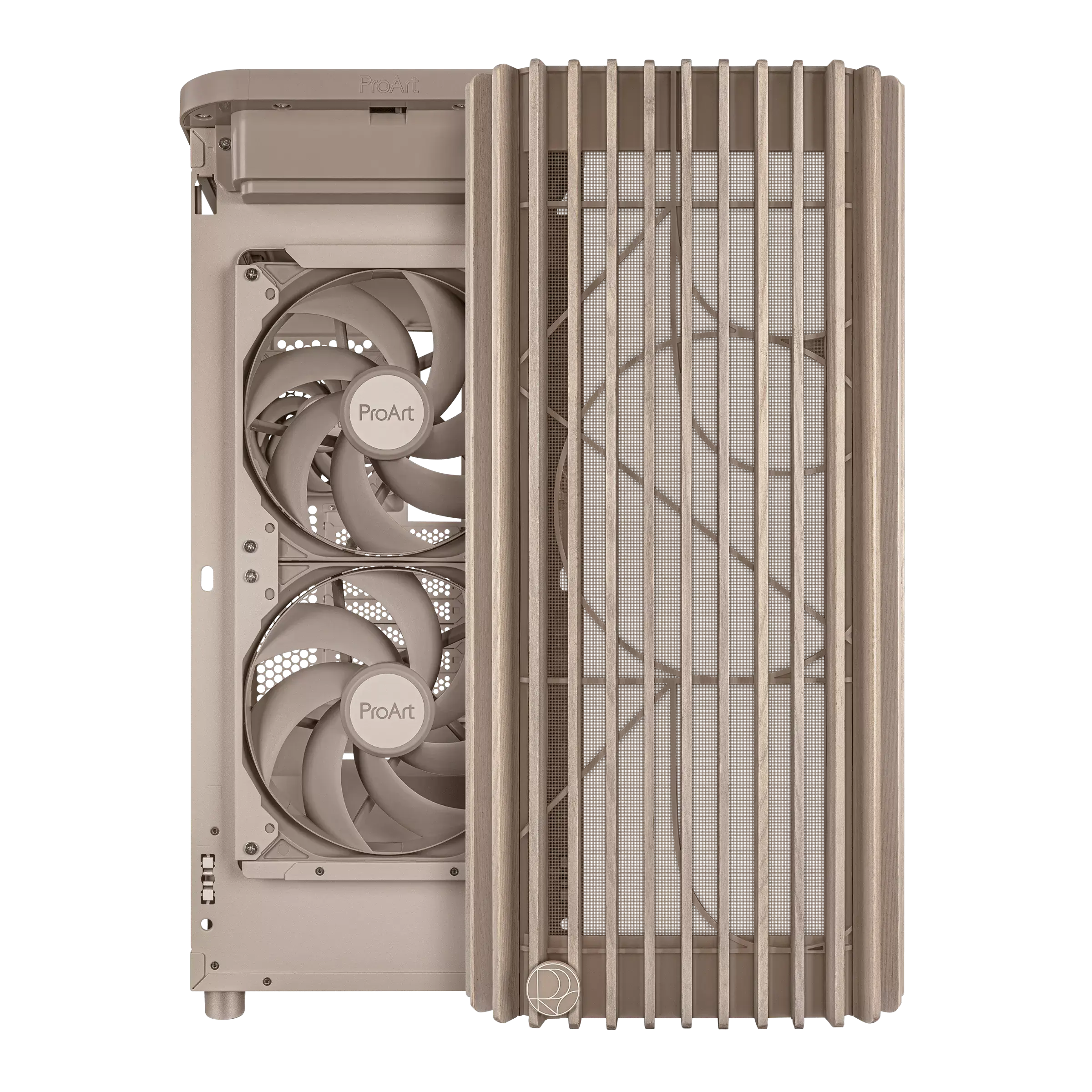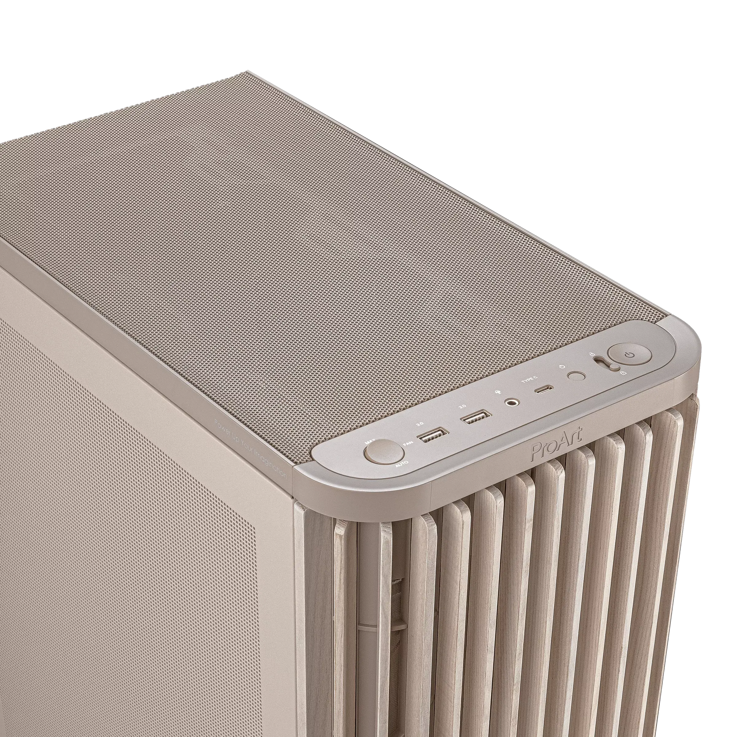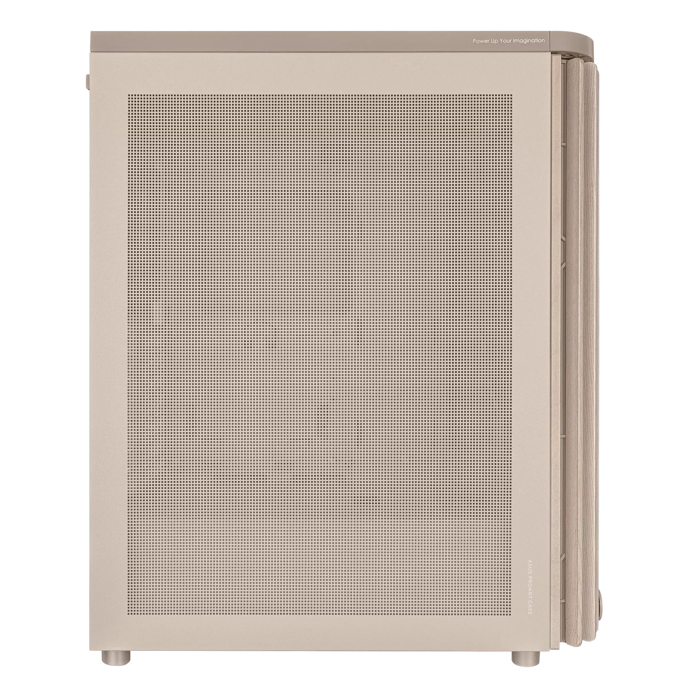ASUS ProArt PA401 Wood Edition Beige – Mesh Panel Отличава се с преден панел от сертифицирано дърво, бежово прахово боядисано шаси и страничен mesh панел за оптимален въздушен поток.