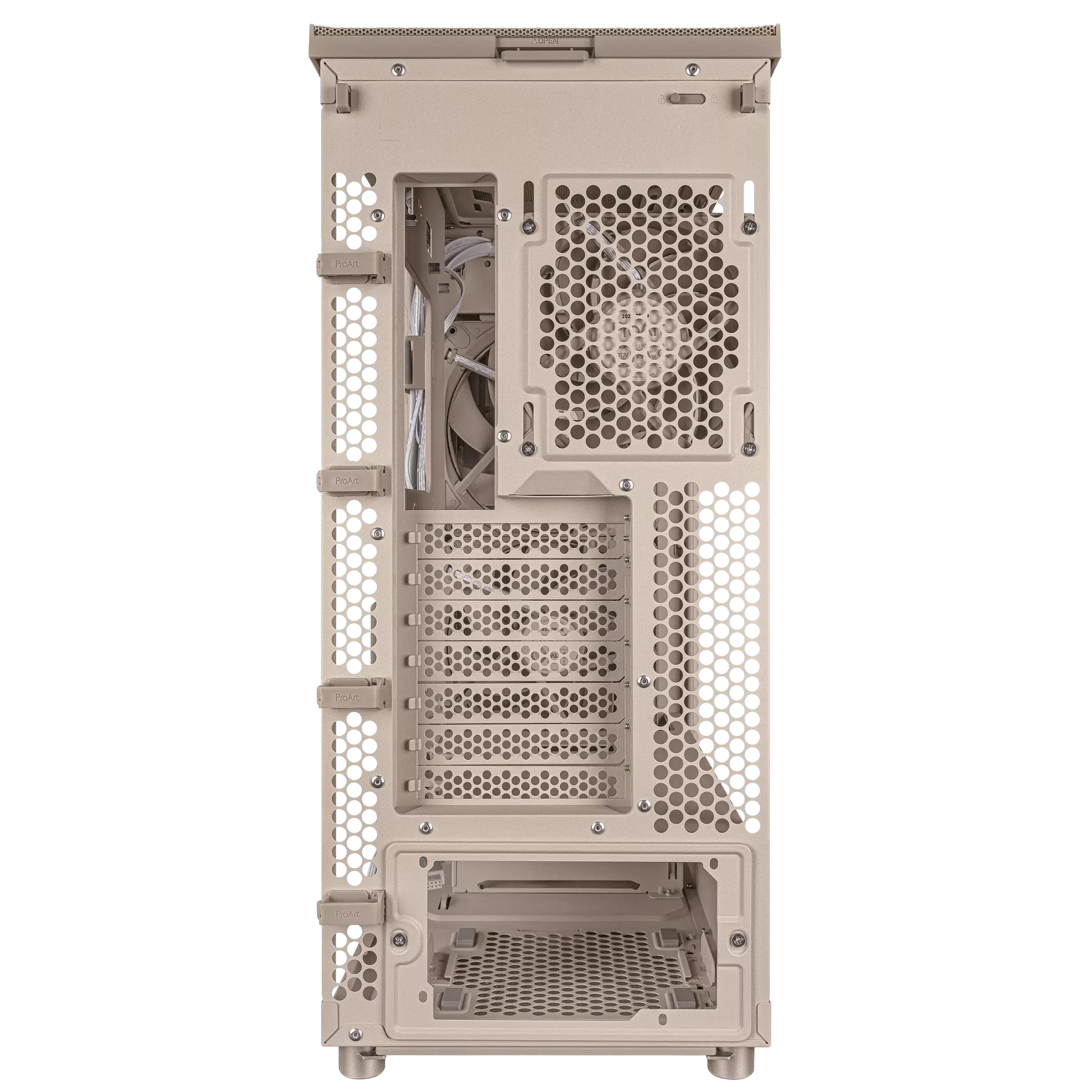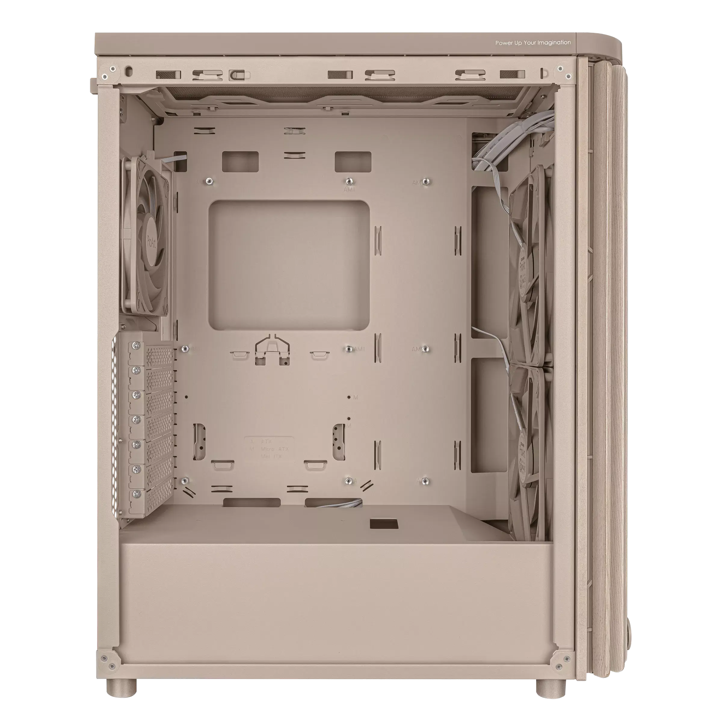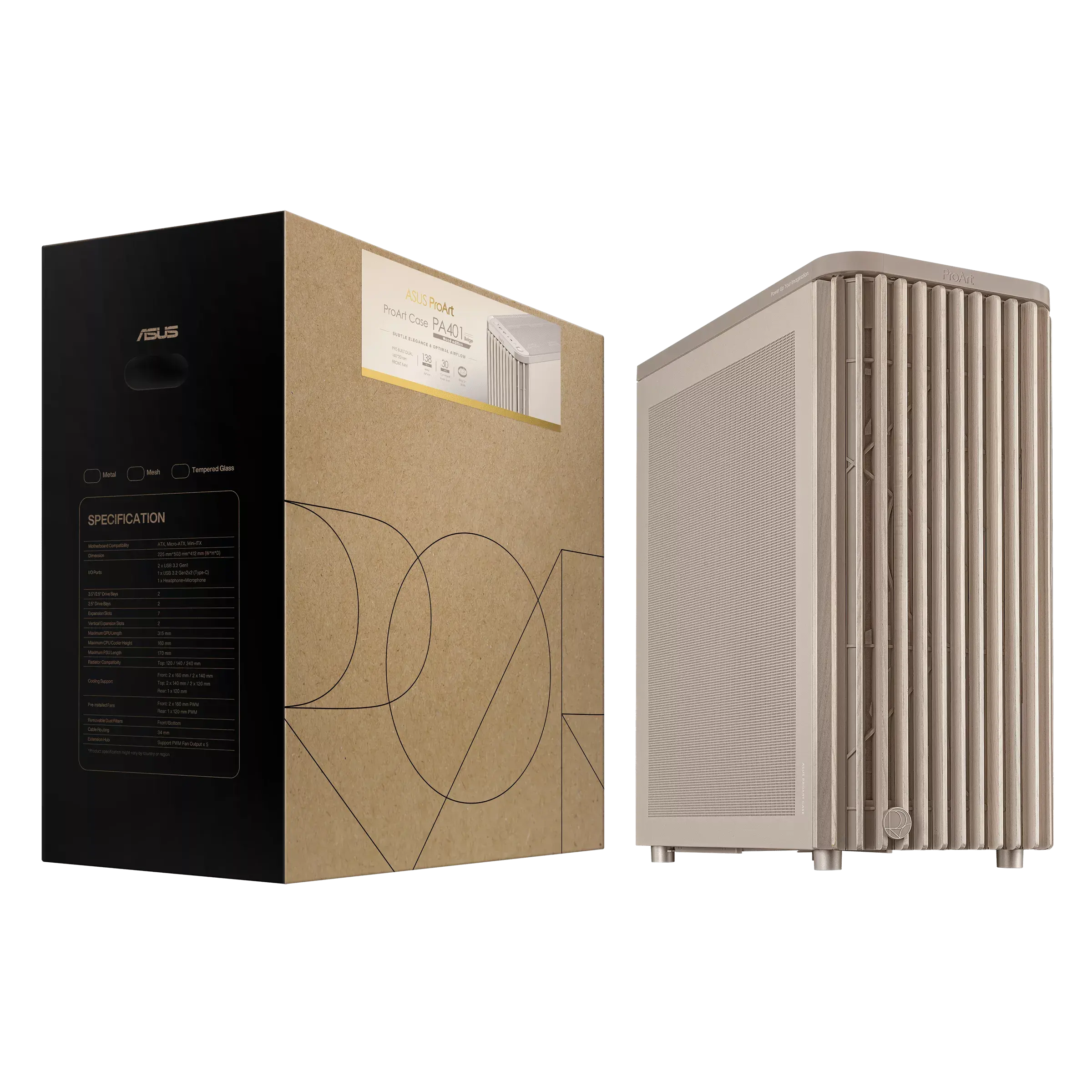 ASUS ProArt PA401 Wood Edition Beige – Mesh Panel Отличава се с преден панел от сертифицирано дърво, бежово прахово боядисано шаси и страничен mesh панел за оптимален въздушен поток.