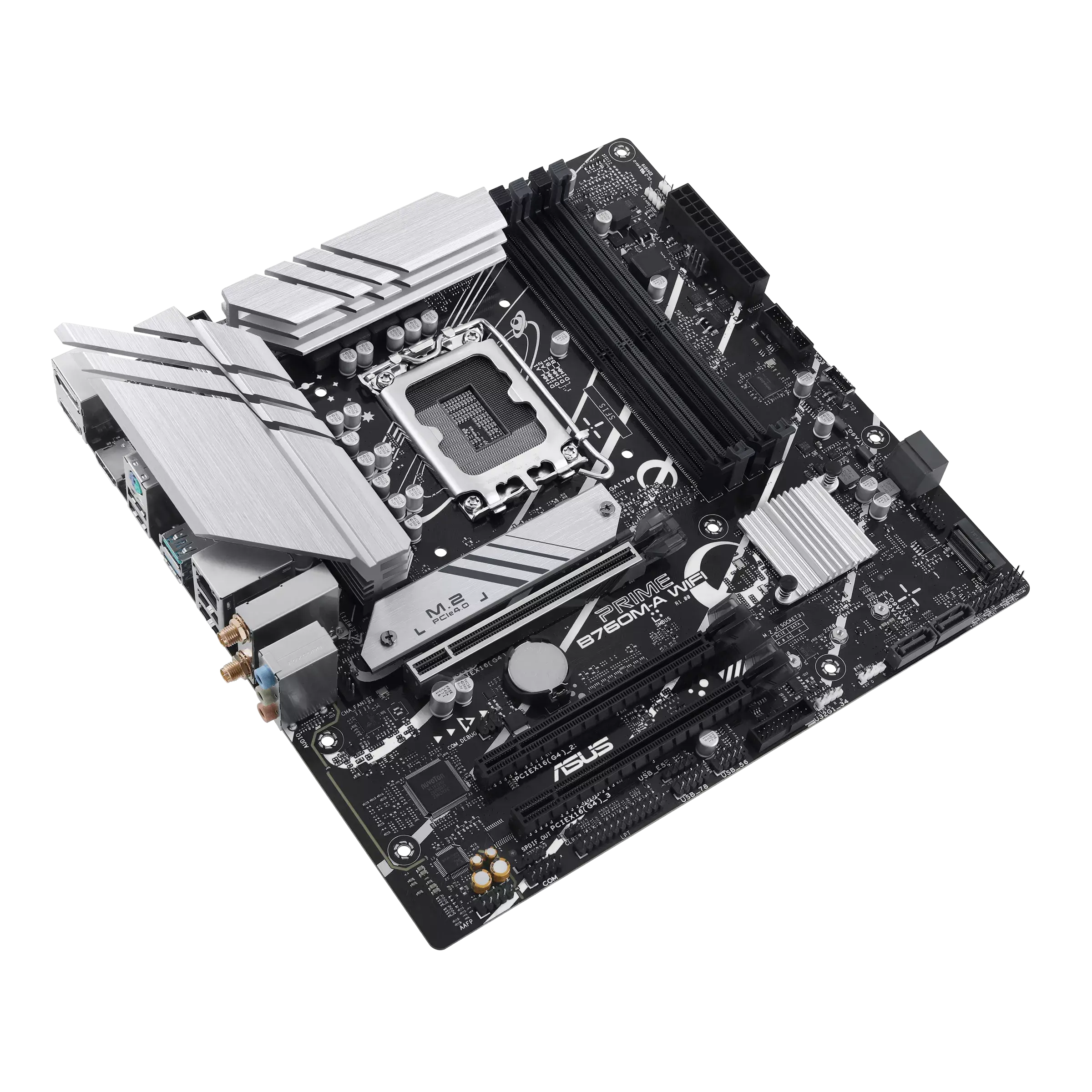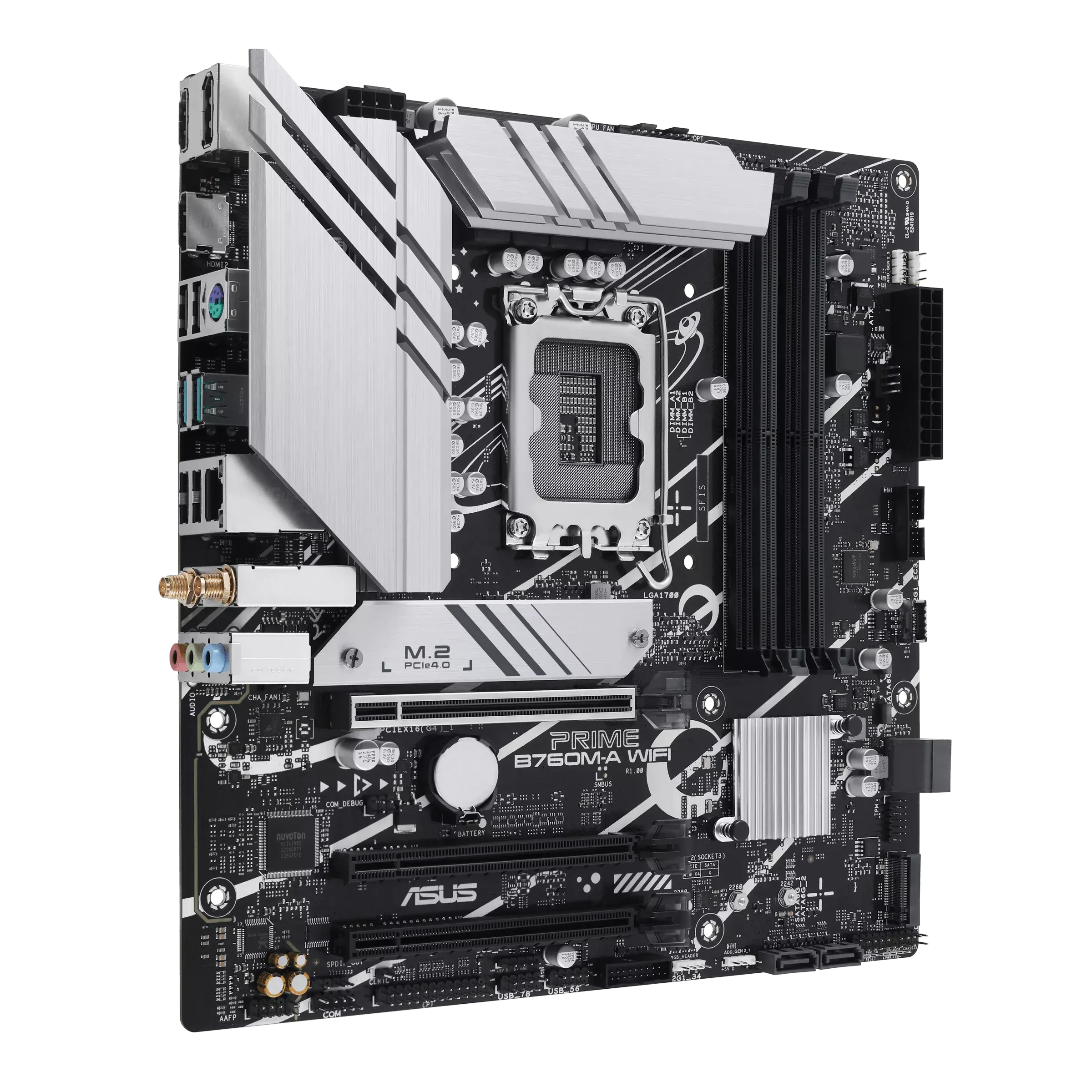 ASUS PRIME B760M-A WIFI е micro-ATX дънна платка с чипсет Intel B760, предназначена за процесори от 12-то, 13-то и 14-то поколение Intel Core (LGA1700). Тя предлага DDR5 памет, PCIe 4.0, вграден Wi-Fi и множество модерни интерфейси.