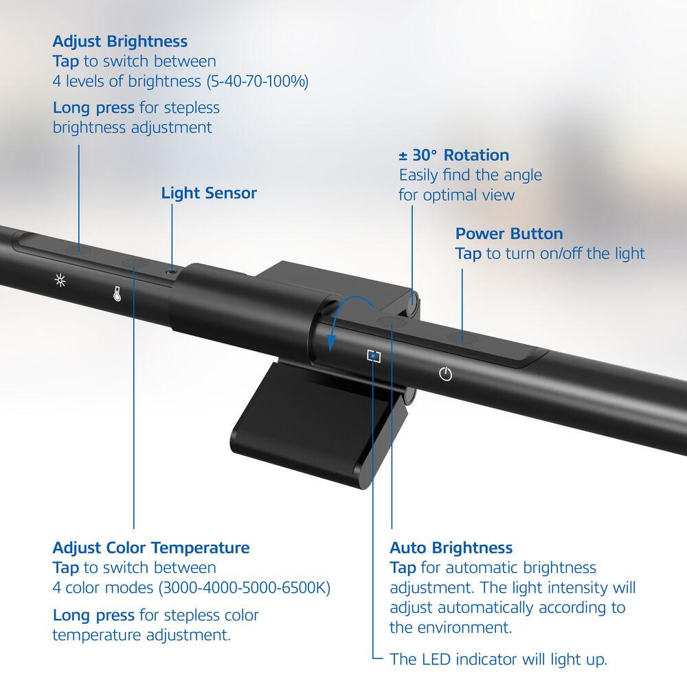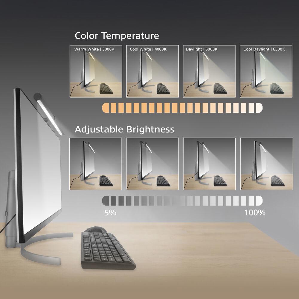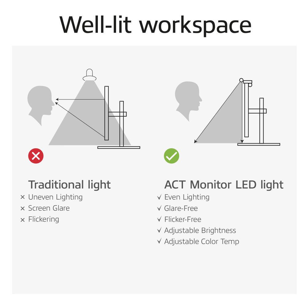 ACT AC8055 е USB захранвана LED лампа за монитор с асиметричен безотблясъчен дизайн, предназначена да осветява работното пространство без отражения върху екрана. Предлага автоматично регулиране на яркостта чрез вграден светлинен сензор, четири режима на цветова температура и функция за запаметяване на последните настройки. Идеално решение за работа в слабо осветени среди с по-малко натоварване на очите.