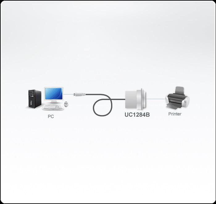 UC1284B е конвертор, който осигурява паралелен принтерски порт през USB интерфейс.