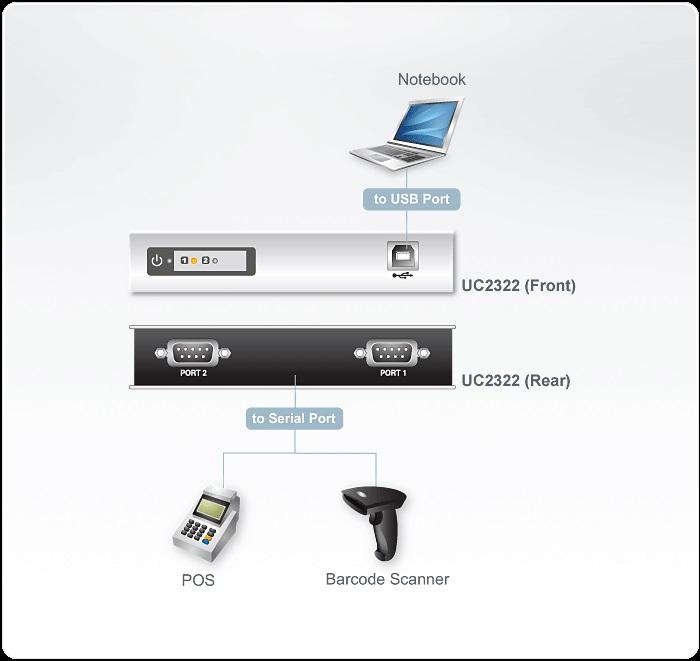 Устройството предоставя външна, plug-and-play RS-232 серийна комуникация за компютри и лаптопи с USB портове.