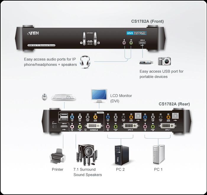 KVM превключвателят CS1782A USB DVI Dual Link KVMP™ комбинира в едно устройство 2-портов KVM превключвател и