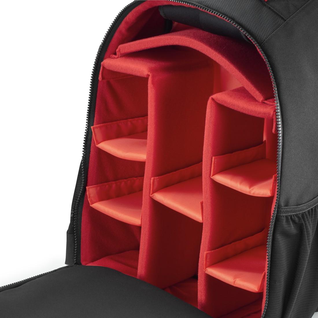 Подплатено отделение за камера с отваряне с двоен цип 8 подвижни вътрешни разделителя в отделението за камерата, 1 неопренов разделител със закопчалка с кука и халка закрепва камерата на място