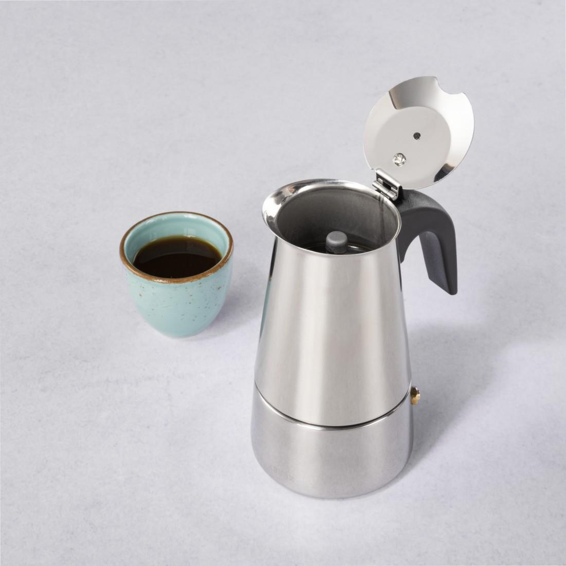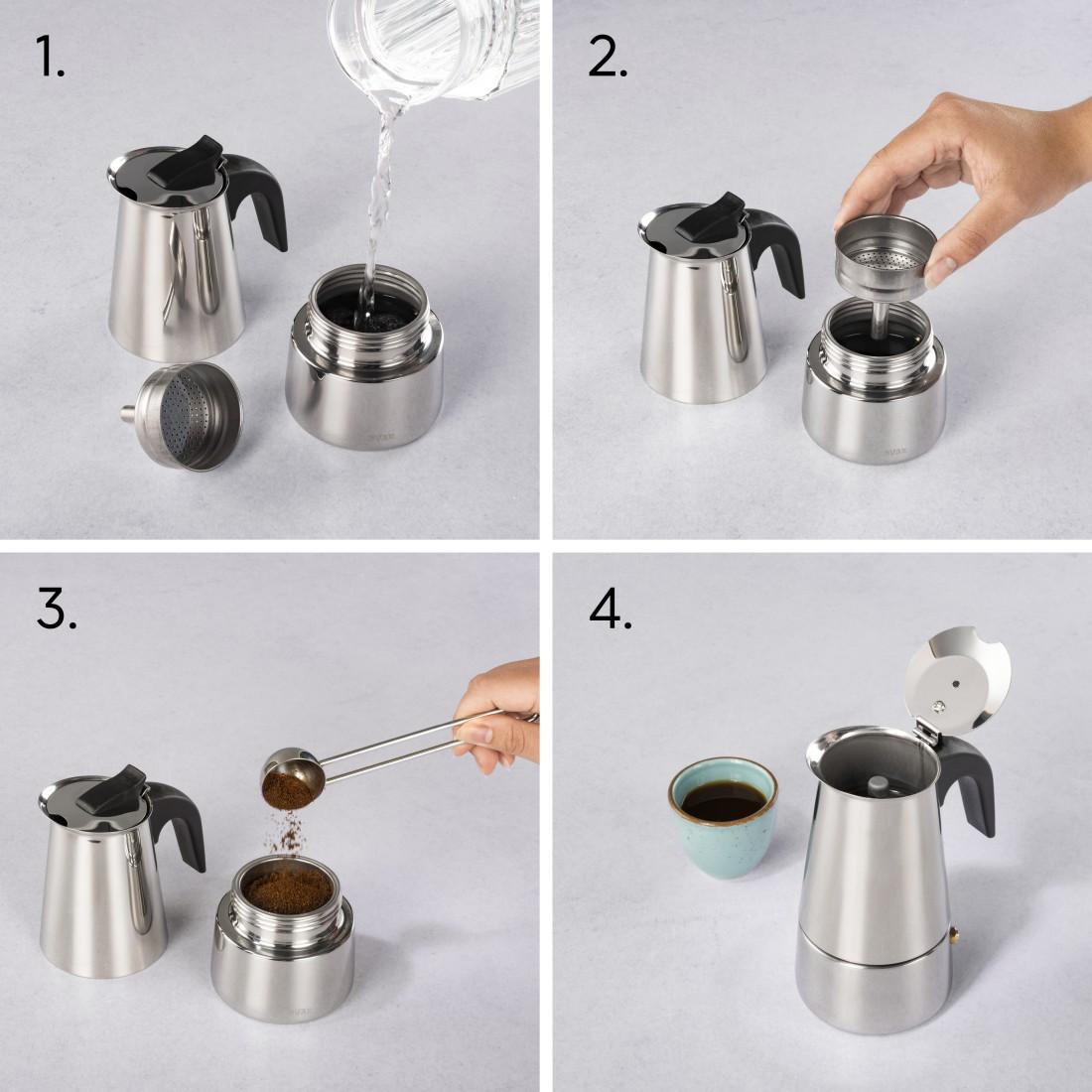 Класическо приготвяне на кафе по италиански начин: с компактната кана за еспресо, изработена от неръждаема стомана, можете лесно да си приготвите добро кафе на всеки котлон, включително индукционен - от черно кафе до еспресо до мока лате, за гости, кафе у дома или по време на пътуване