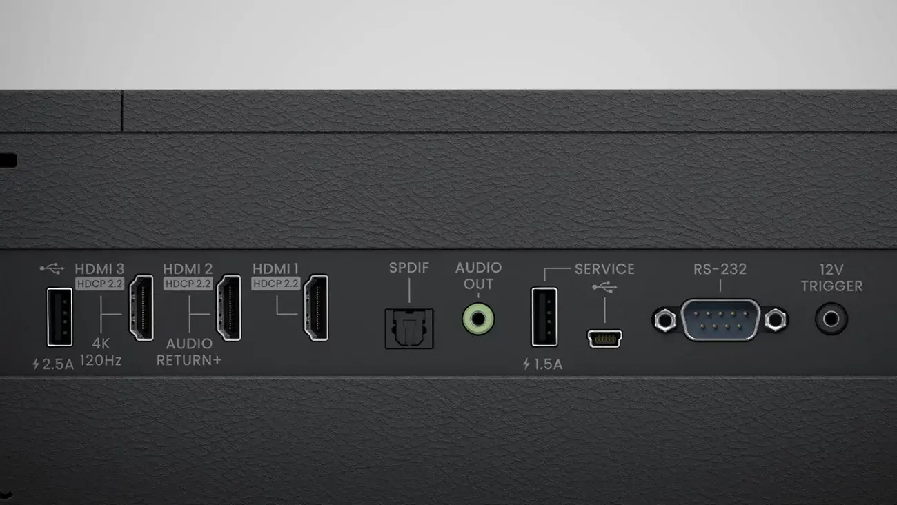 Входове/изходи: HDMI x3 (HDMI-1 2.0b/HDCP2.2; HDMI-2 2.0b/HDCP2.2; HDMI-3 2.1/HDCP2.2; вътрешен HDMI 2.0b за Android TV); USB-A x3 (2.0; захранване 1.5A/1.0A/2.5A), USB mini-B (service), RS-232, 12V Trigger, 3.5 mm Audio Out, S/PDIF (Multi-Channel RAW), HDMI eARC (Dolby Atmos).