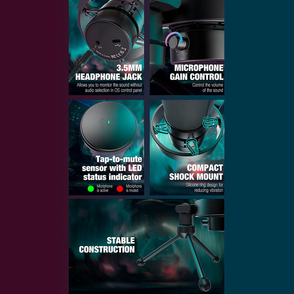RGB USB-C микрофон с бутон за заглушаване, жак за слушалки, поп филтър