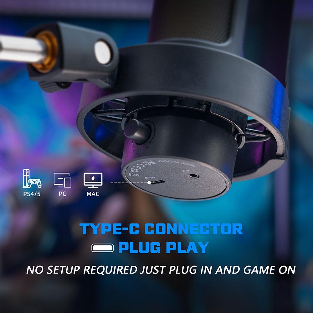 RGB USB-C микрофон за стрийминг, подкасти, с бутон за заглушаване, жак за слушалки и поп филтър. Съвместим с PC, PS4, PS5, Mac